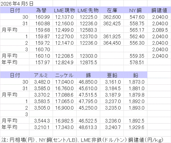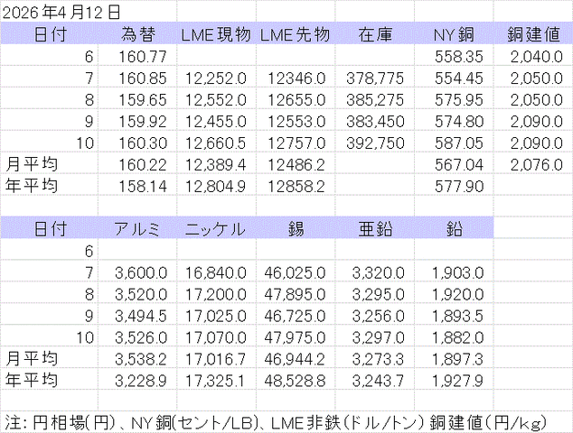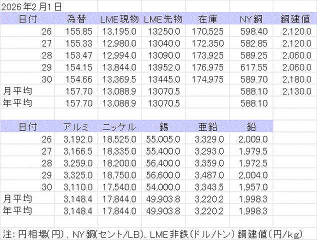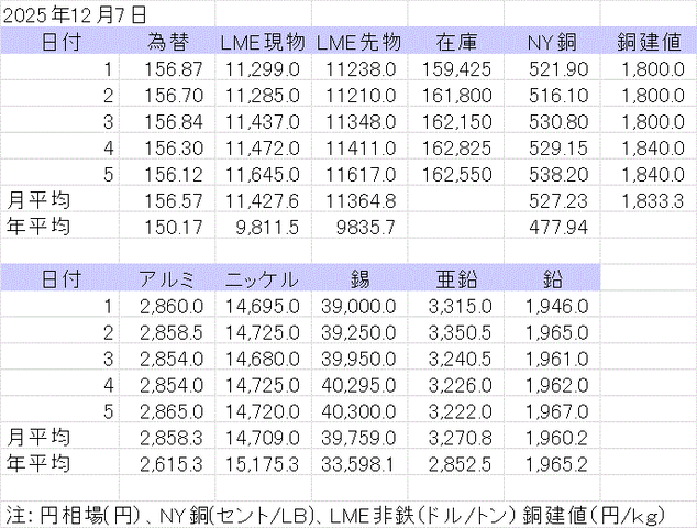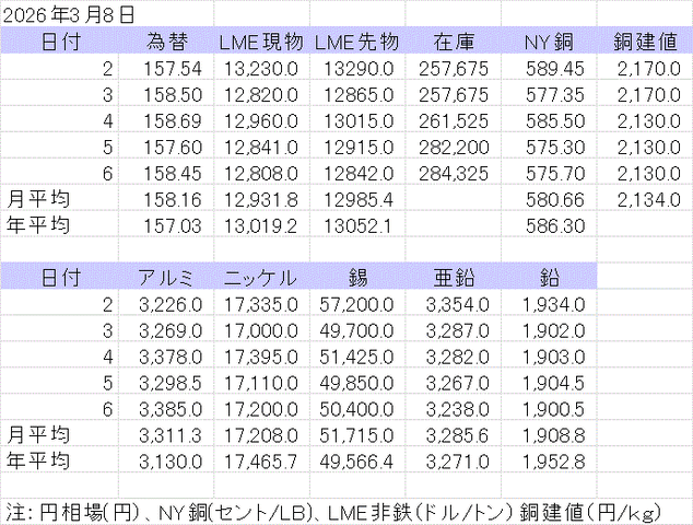 週間銅相場表